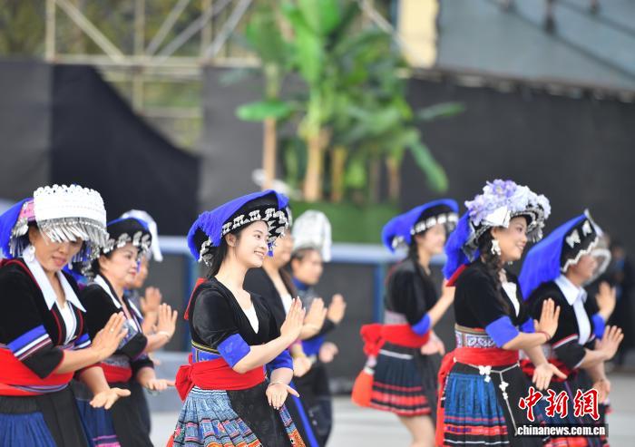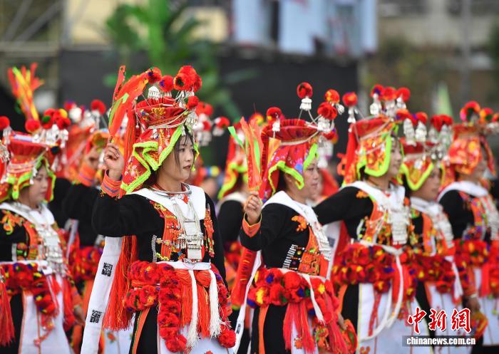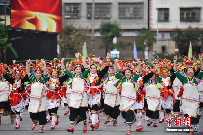 今日各族公众身着节日艳服巡行上演。当日,天处中越边疆的云北省白河哈僧族彝族自制州金仄苗族瑶族傣族自制县举办创建40周年庆贺年夜会,各族公众悲散1堂、手舞足蹈,文艺表演、特质产物铺销等,让贵宾、旅客明白该县奇特魅力,感触感染“有1种啼云北的死活”。中新社记者 黄兴鸿 摄