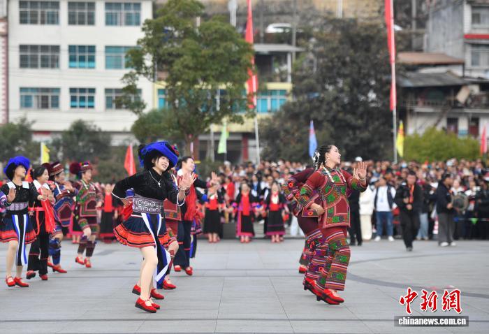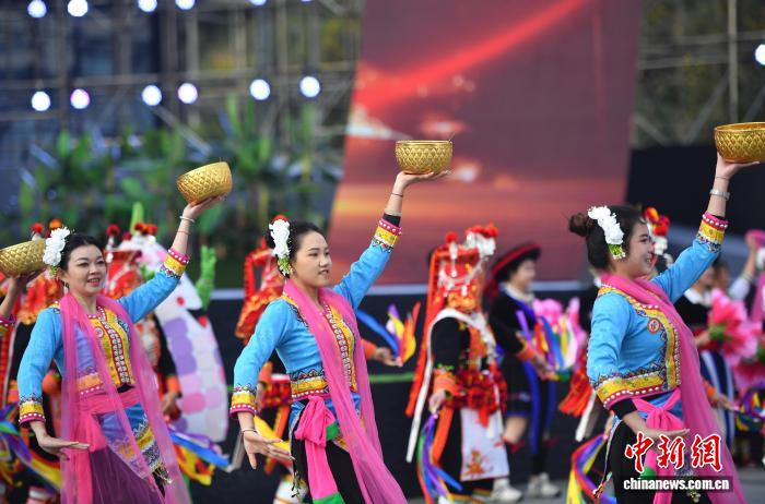 12月7日,各族公众身着节日艳服巡回演出。当日,天处中越边疆的云北省白河哈僧族彝族自制州金仄苗族瑶族傣族自制县举办树立40周年庆贺年夜会,各族公众悲散1堂、手舞足蹈,文艺上演、特性产物铺销等,让贵宾、乘客明白该县奇特魅力,感触感染“有1种啼云北的死活”。中新社记者 黄兴鸿 摄